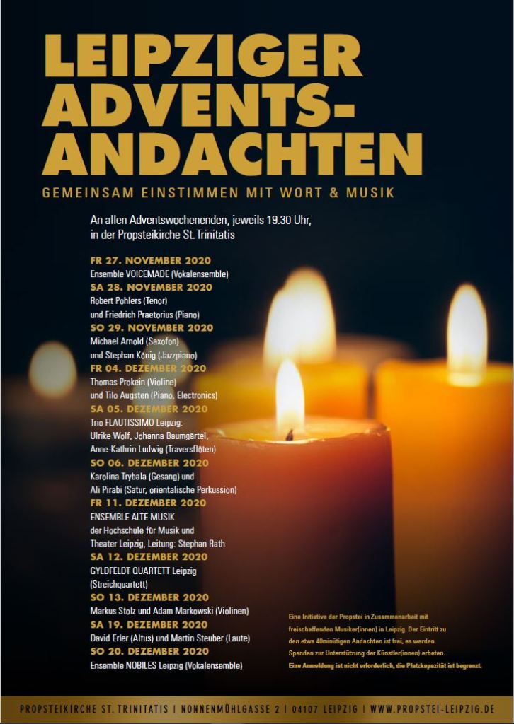 Es ist uns eine große Ehre, die kurzfristig ins Leben gerufene Reihe der Leipziger Adventsandachten in der Propsteikirche Leipzig am kommenden Freitag, den 27.11.2020 eröffnen zu dürfen! 19:30 Uhr geht es los zur Einstimmung auf den ersten Advent. Herzliche Einladung!