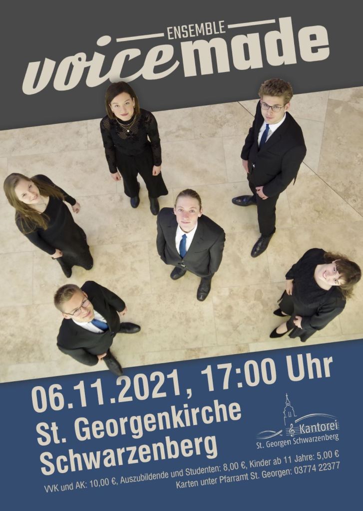 Voller Tatendrang steht uns gleich das nächste Konzertwochenende an. Diesmal geht es nach dem „Konzert für Chöre“ in der Leipziger Taborkirche am Freitag um 19 Uhr, welches bereits im vergangenen Jahr hätte stattfinden sollen, gen Süden. Die erste Reisestation heißt Schwarzenberg, wo wir in der wunderschönen Georgenkirche singen dürfen. Am Sonntag dann geht es zum Abschluss des Wochenendes nach Weiden in der Oberpfalz für ein Konzert, welches ursprünglich bereits für Mai 2020! im Kalender stand und pandemiebedingt mehrfach verschoben werden musste. Wir freuen uns sehr, dass dieses Konzert nach gut anderthalb Jahren nun endlich stattfinden kann!