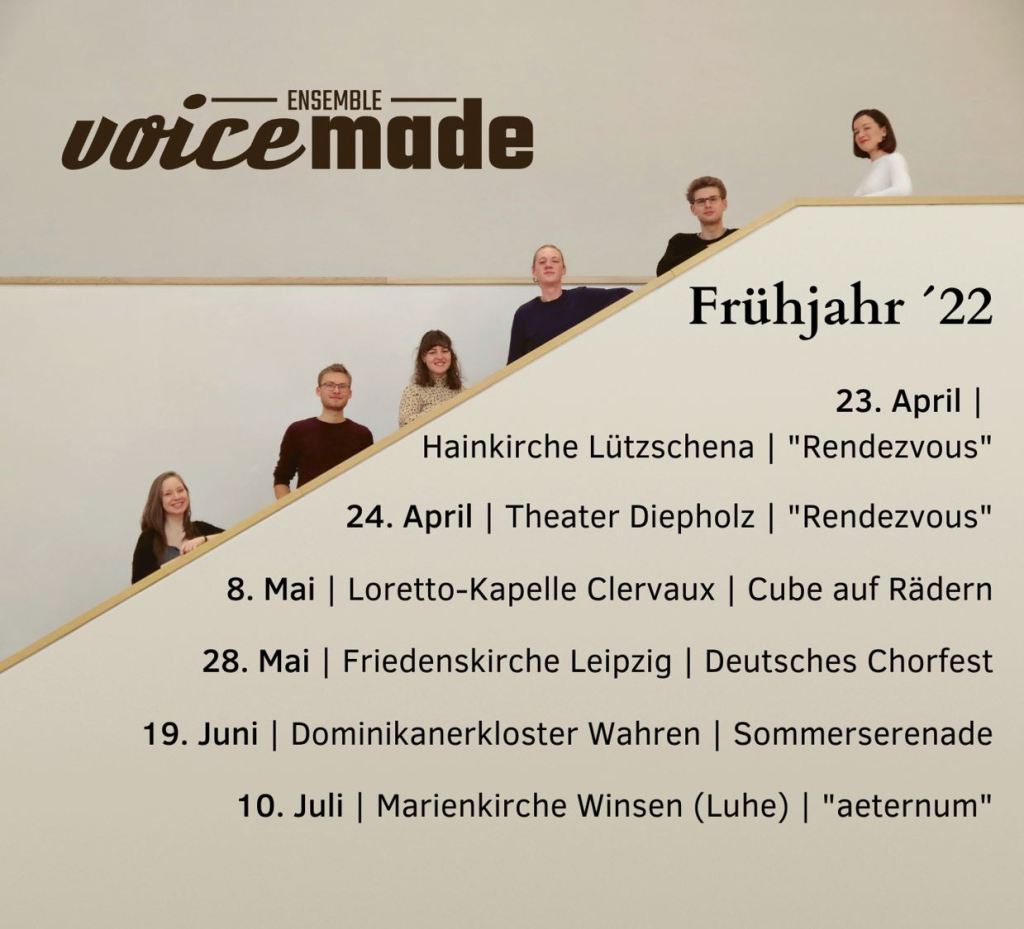 Mit einem Leipziger Universitätsgottesdienst haben wir am vergangenen Wochenende unsere Konzertsaison 2022 eröffnet und freuen uns nun auf zahlreiche Auftritte in den kommenden Monaten! Gleich nach Ostern geht es weiter mit der Premiere unseres neuen Programmes „Rendezvous – Begegnungen der musikalischen Art“. Weitere Informationen gibt es wie immer hier.