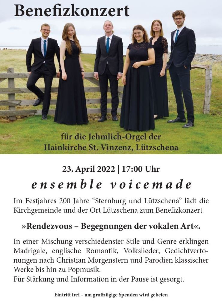 Kurz nach Ostern starten auch wir nun in unsere Konzertsaison 2022 und freuen uns sehr auf über 25 wunderbare Auftrittsgelegenheiten! Den Auftakt macht die Premiere unseres neuen Programms „Rendezvous“ in einem Benefizkonzert für die Jehmlich-Orgel der Hainkirche Lützschena am kommenden Samstag um 17:00 Uhr. Am Tag darauf geht es dann auch gleich auf Tour und wir werden im Theater Diepholz zu erleben sein. Herzliche Einladung!