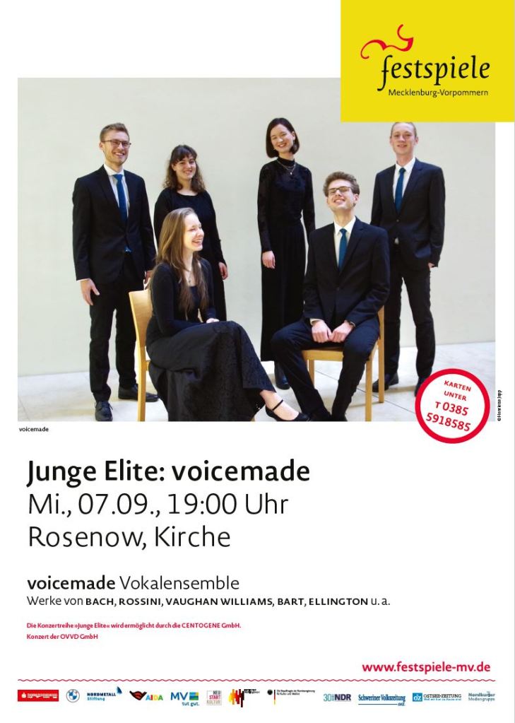 Zum Saisonauftakt einer prall gefüllten und spannenden Spielzeit 2022/23 steht für uns unsere Premiere bei den Festspielen Mecklenburg-Vorpommern an. Am Mittwoch um 19 Uhr werden wir in der Dorfkirche Rosenow im Rahmen der Reihe „Junge Elite“ unser bunt-gemischtes Programm „Leipziger Allerlei“ singen. Weitere Informationen dazu gibt es hier, herzliche Einladung!