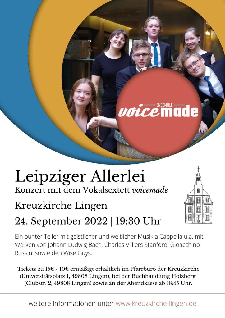 Am kommenden Wochenende geht es für uns in den Westen von Deutschland, zunächst mit einem Besuch bei Stina und unserem Agenten Wolfram Fette in Hannover und dann zwei Konzerten mit unserem „Leipziger Allerlei“ in der Kreuzkirche Lingen und der Aula der Sharounschule Marl. Wir freuen uns sehr darauf, herzliche Einladung!