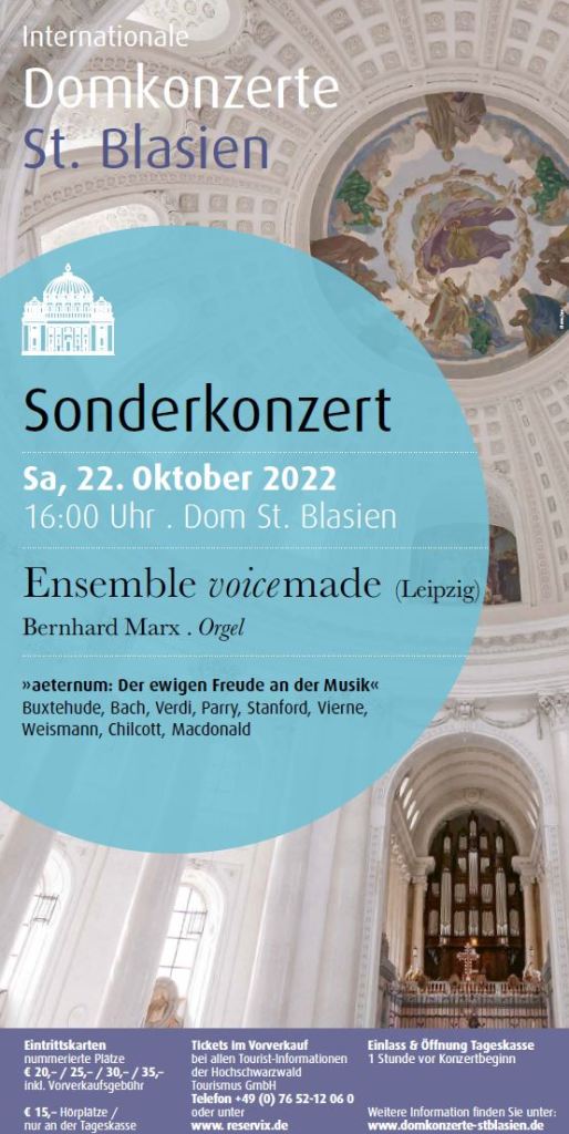 Am kommenden Wochenende führt uns der Tourplan einmal mehr in den Süden der Bundesrepublik: Am Samstagnachmittag um 16 Uhr gastieren wir im imposanten Dom zu St. Blasien, wo wir am Sonntagmorgen auch den Gottesdienst musikalisch gestalten, ehe wir direkt im Anschluss weiterfahren für ein Leipziger Allerlei im Rahmen der Opernfestspiele Heidenheim. Wir freuen uns sehr darauf, herzliche Einladung!