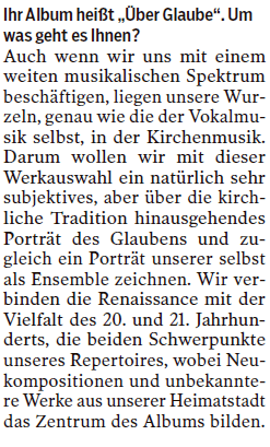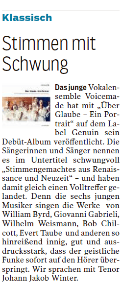 Genau einen Monat nach dem Release unseres Debüt-Albums „Über Glaube – Ein Portrait“ gab es einmal wieder etwas darüber zu lesen. Herzlichen Dank an Burkhard Schäfer für die so positive Rezension und das gestern in der Südwest-Presse erschienene Interview!