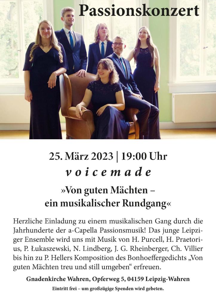 Dass wir Fans von Passionsmusik sind, ist schon lange kein Geheimnis mehr… nicht umsonst war auch unser erstes eigenes Konzert vor genau fünf Jahren ein Passionskonzert. Nun laden wir sehr herzlich ein zu unserer nächsten Passionsmusik, nach einiger Zeit wieder auch einmal in unserer Heimatstadt Leipzig: 25.03.2023, 19:00 Uhr, Gnadenkirche Leipzig-Wahren. Es wartet ein spannender Konzertabend mit viel unbekanntem und selten zu hörendem Repertoire.