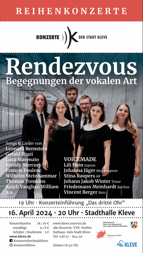 Wir laden herzlich ein zu unserem nächsten Konzert in der Stadthalle Kleve, dem ersten Konzert unserer Ensemblegeschichte an einem Dienstag (alle anderen Wochentage hatte es tatsächlich schon gegeben…)! Auf dem Programm steht wieder unser Rendezvous mit weltlicher Vokalmusik unterschiedlichster Genres der Alten Musik sowie des 20. Jahrhunderts.