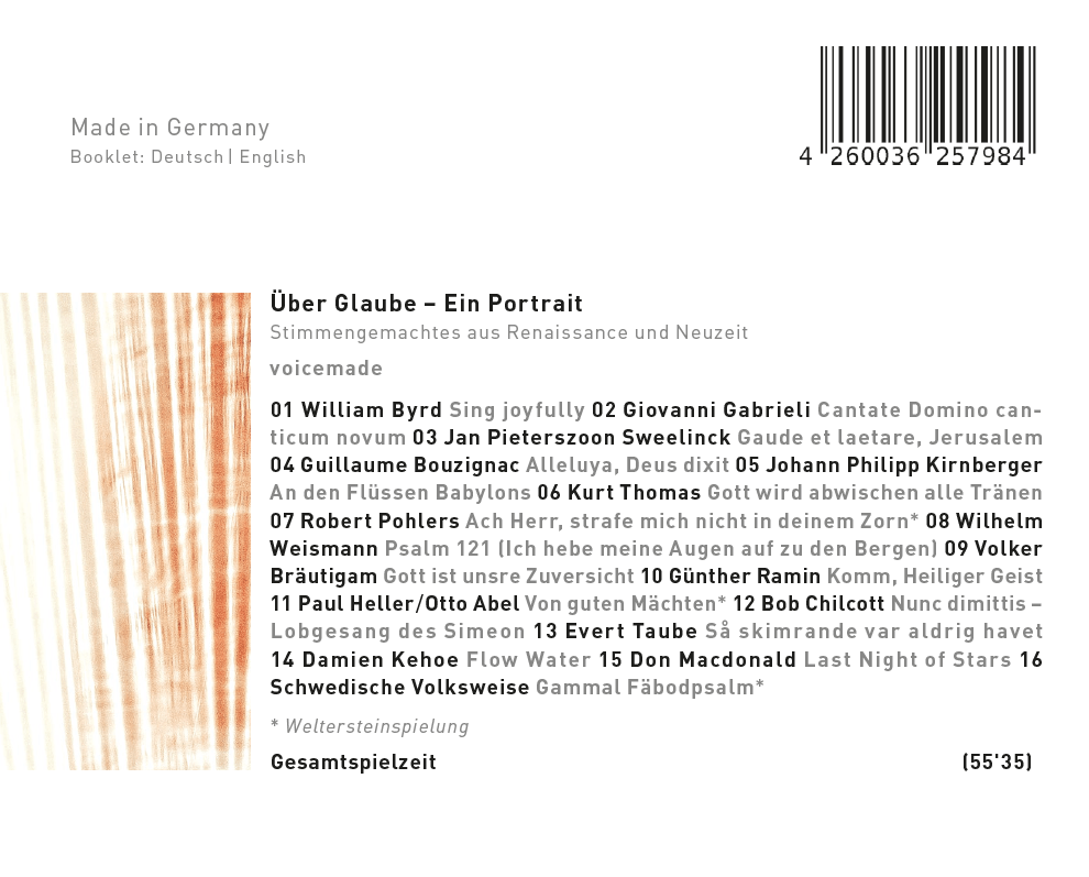 Unser Debüt-Album, erschienen im Februar 2023 beim Leipziger Klassik-Label Genuin. Unter dem Titel „Über Glaube – Ein Portrait“ vereinen wir geistliche Musik aus Renaissance und Neuzeit, wobei Psalmvertonungen von Leipziger Komponisten des 20. und 21. Jahrhunderts im Vordergrund stehen. Mit dabei sind u.a. Ersteinspielungen von Robert Pohlers, Paul Heller, Damien Kehoe sowie unserer ehemaligen Altistin Ebba Lejonclou.